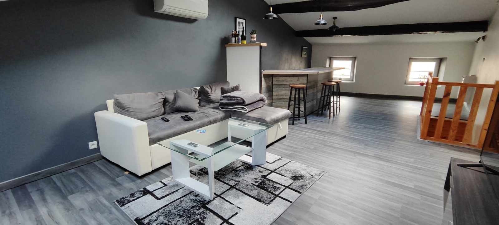 A l’étage ; grand espace salon joliment aménagé sous-toit, avec possibilité de diviser (pour faire une ou deux chambres).